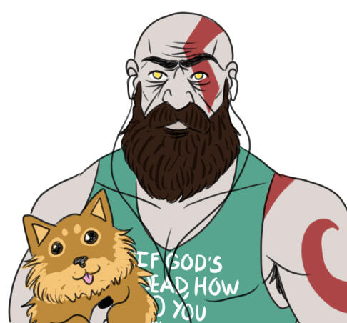 Sure, the gods will never let him rest. But that won't stop him from protecting your dogs from them. Epitome of never wanted a dog before this but would care for it with his life. He is stern and not overly affectionate, but your dog will feast on the finest cuts from the hunt Kratos brought them along on.